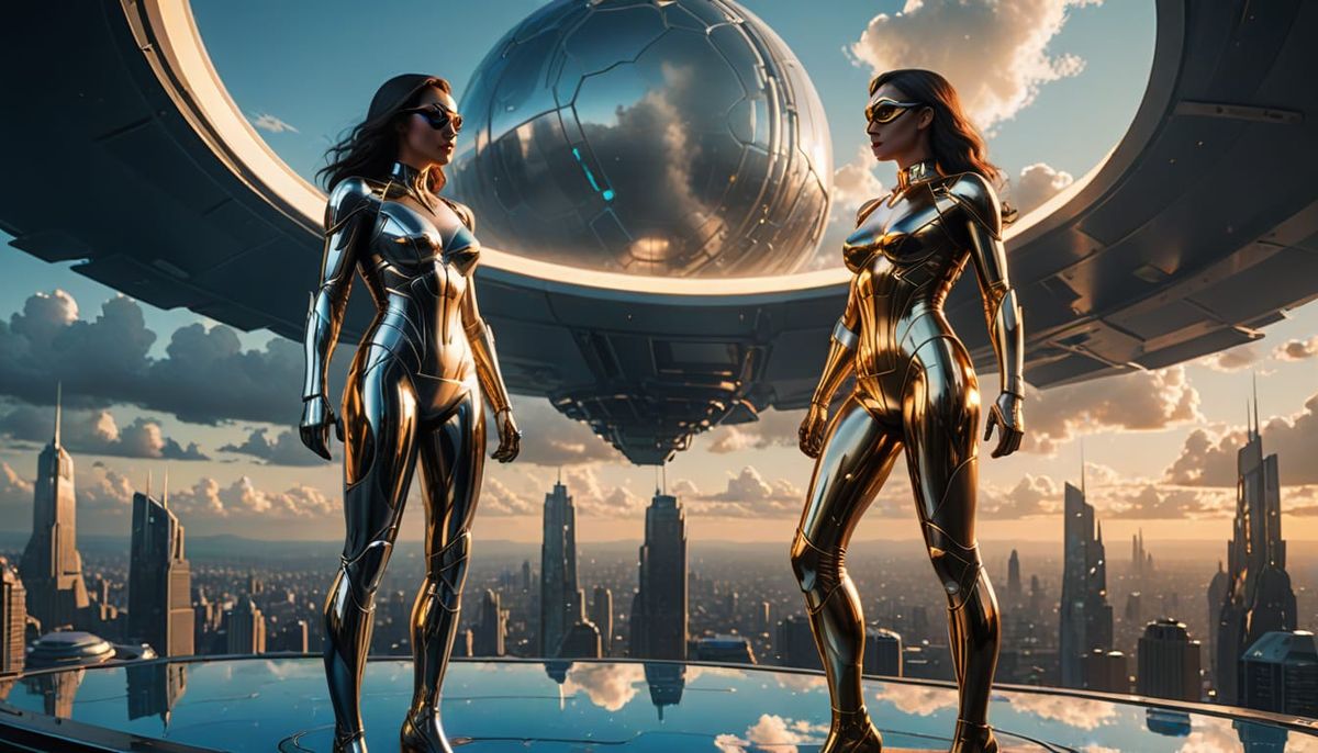 This image shows two chrome latex-clad figures, one a superheroine and one a supervillainess, facing each other on a platform above a futuristic city. The image is in a Syd Mead-inspired style, featuring neon lights and glossy reflections.
