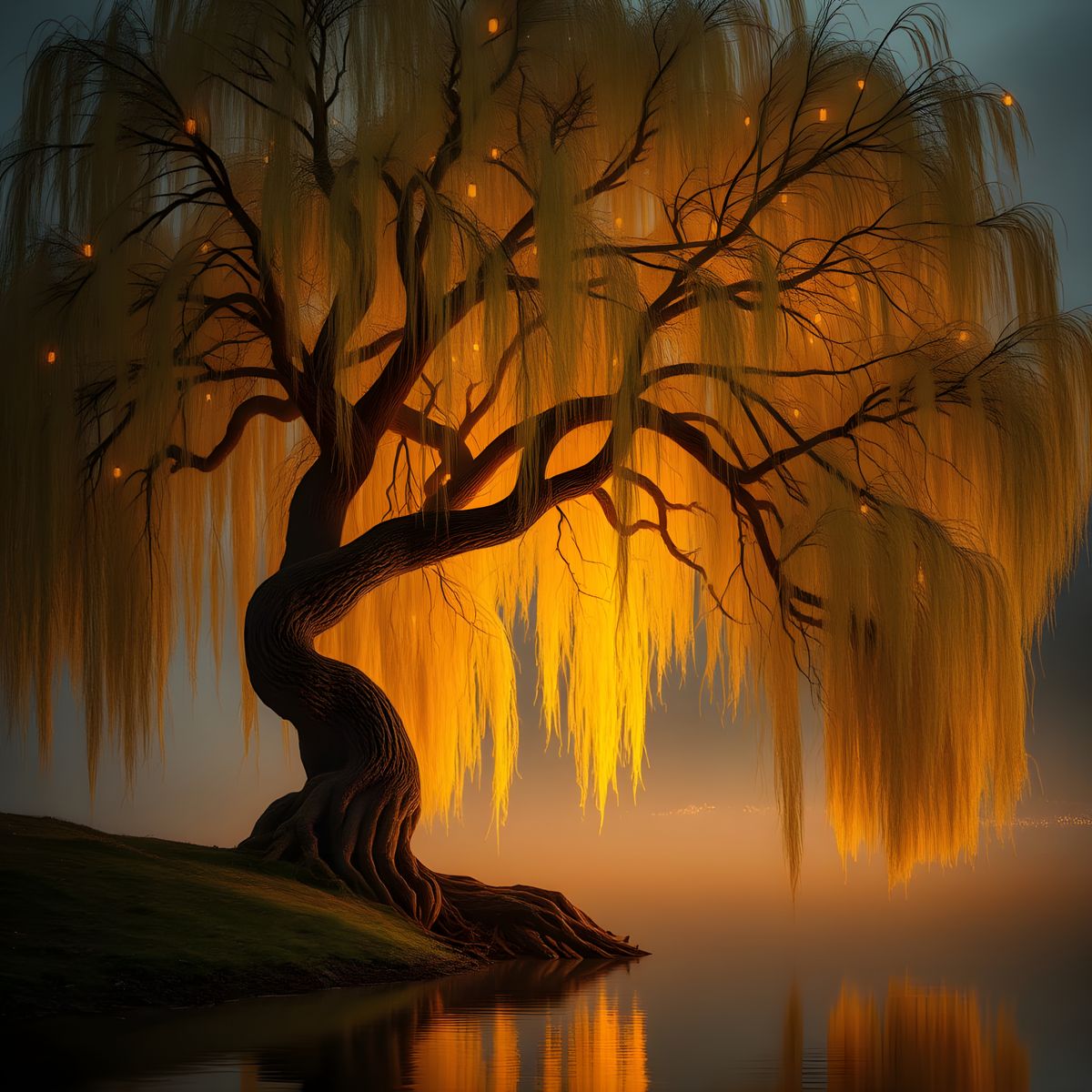 This serene scene captures a weeping willow tree standing sentinel on a river bank, its branches sweeping downwards to kiss the calm waters, as fireflies dance and glow in the warm, golden darkness beneath, in a photorealistic, film-inspired style reminiscent of cinematic masters.