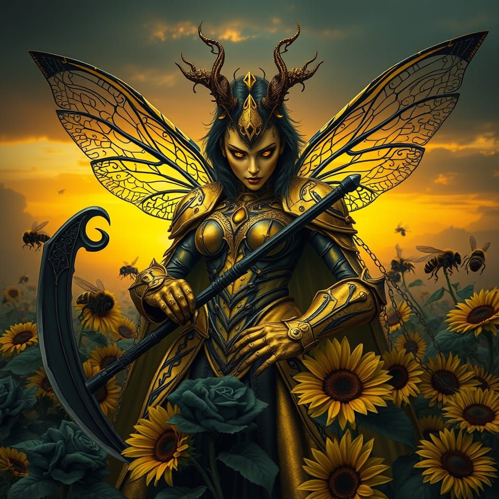 This image shows a powerful, iridescent bee warrior holding a scythe, surrounded by dark fantasy elements, black roses, and a swarm of bees, set against a moody sunset backdrop.