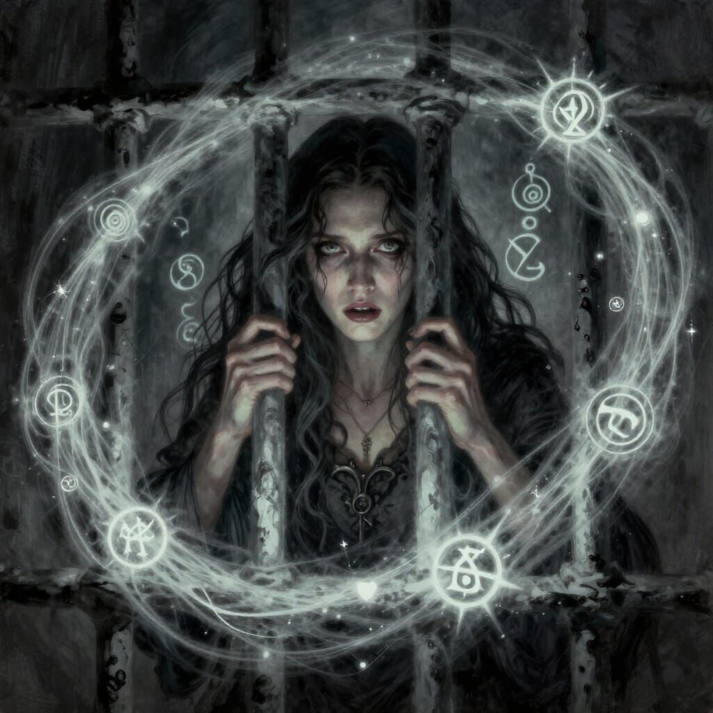 A dark fantasy image depicting an ethereal witch confined by glowing magical bars. Eldritch symbols and dramatic chiaroscuro lighting create a palpable sense of dread and otherworldly atmosphere.
