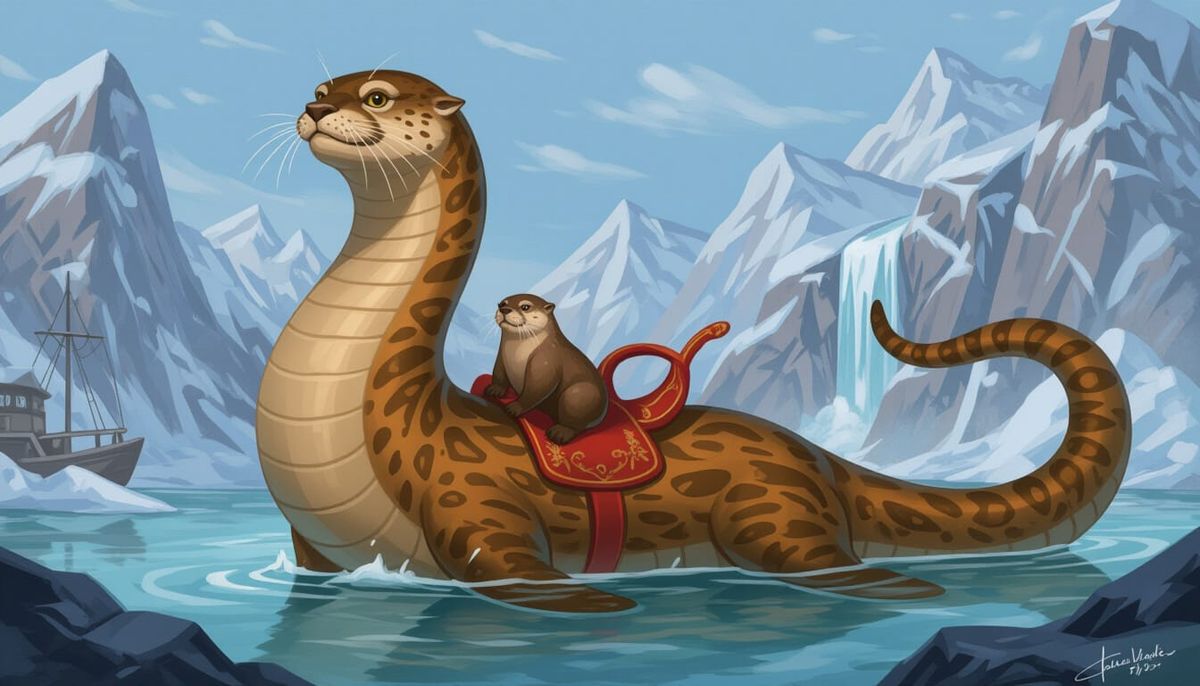 This image shows a hybrid fantasy creature with a muscular snake neck, otter's head, walrus tusks, and otter's ears. Its long, muscular, serpentine body resembles a tiger without fur, presented as 3D anime art.