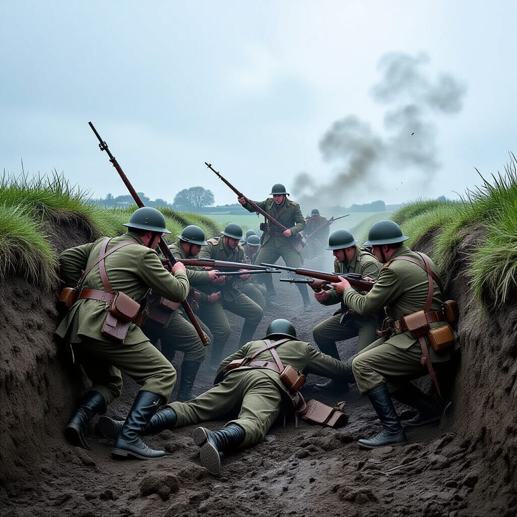 This image depicts a fierce battle scene. The stark imagery captures the brutal reality of trench warfare, with soldiers engaged in intense combat.