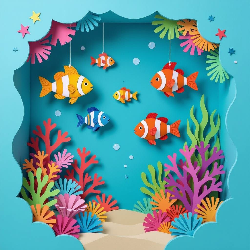 A colorful diorama of a coral reef with paper fish and anemones suspended from above. This whimsical and enchanting scene evokes a children's storybook illustration.