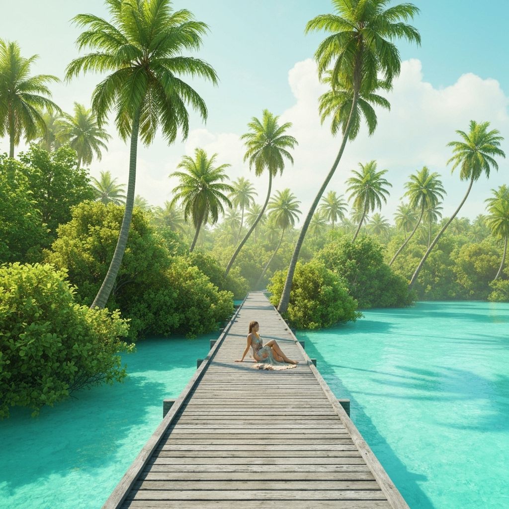 A hyperrealistic image of a woman relaxing on a boardwalk extending into a lagoon. The scene features tropical foliage, palm trees, soft sunlight and shadows in a cinematic style. The image evokes a dreamlike retreat.