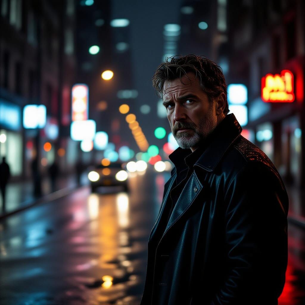 This image captures a somber actor on a dark, wet city street. Shot with dramatic lighting and rich color grading, it evokes a cinematic, atmospheric mood.