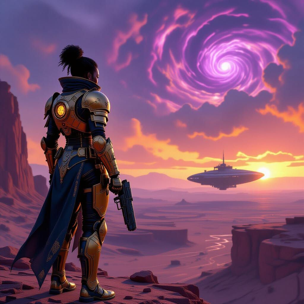 This image depicts an African American cyborg gunslinger in detailed brass armor on a clifftop, overlooking an alien desert. A derelict spaceship is visible under a colorful nebula sky.