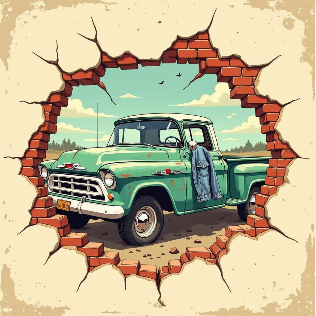 This image shows a classic pickup truck breaking through a brick wall. The artwork features muted earthy tones and a distressed, vintage poster aesthetic, evoking a sense of nostalgia and ruggedness.