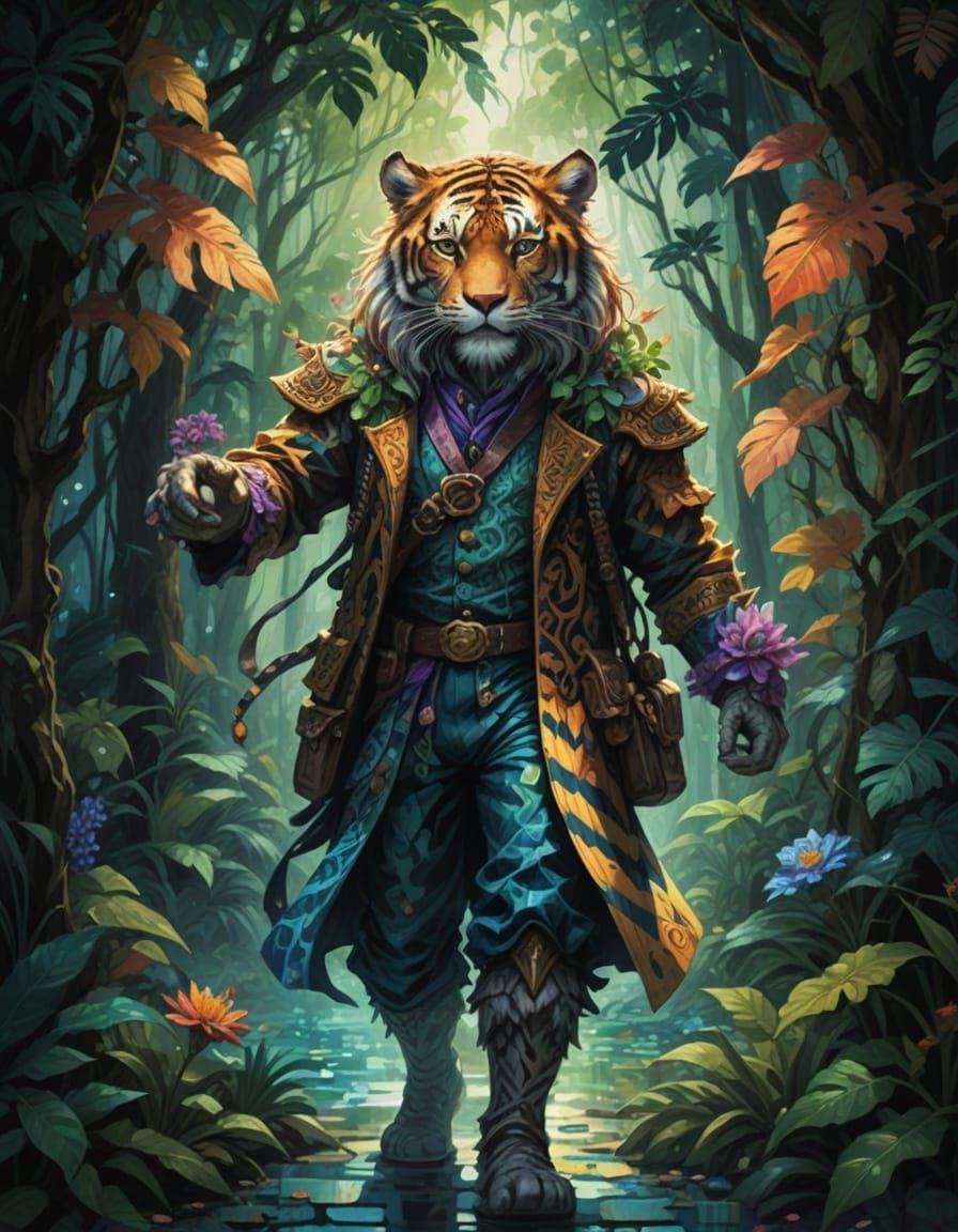 This stunning illustration features a handsome supernatural character adorned in elaborate fantasy attire, with intricate geometric patterns and vibrant, textured details, reminiscent of 19th-century Impressionist art and maximalist design.