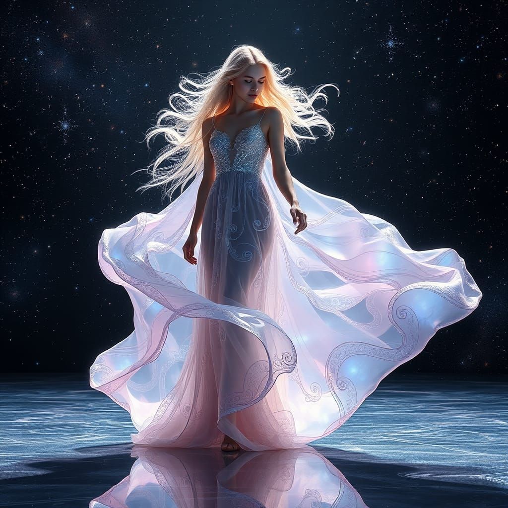 A mesmerizing image of a woman in an iridescent gown standing on a reflective floor. The cosmic backdrop enhances the otherworldly atmosphere in a digital art style.