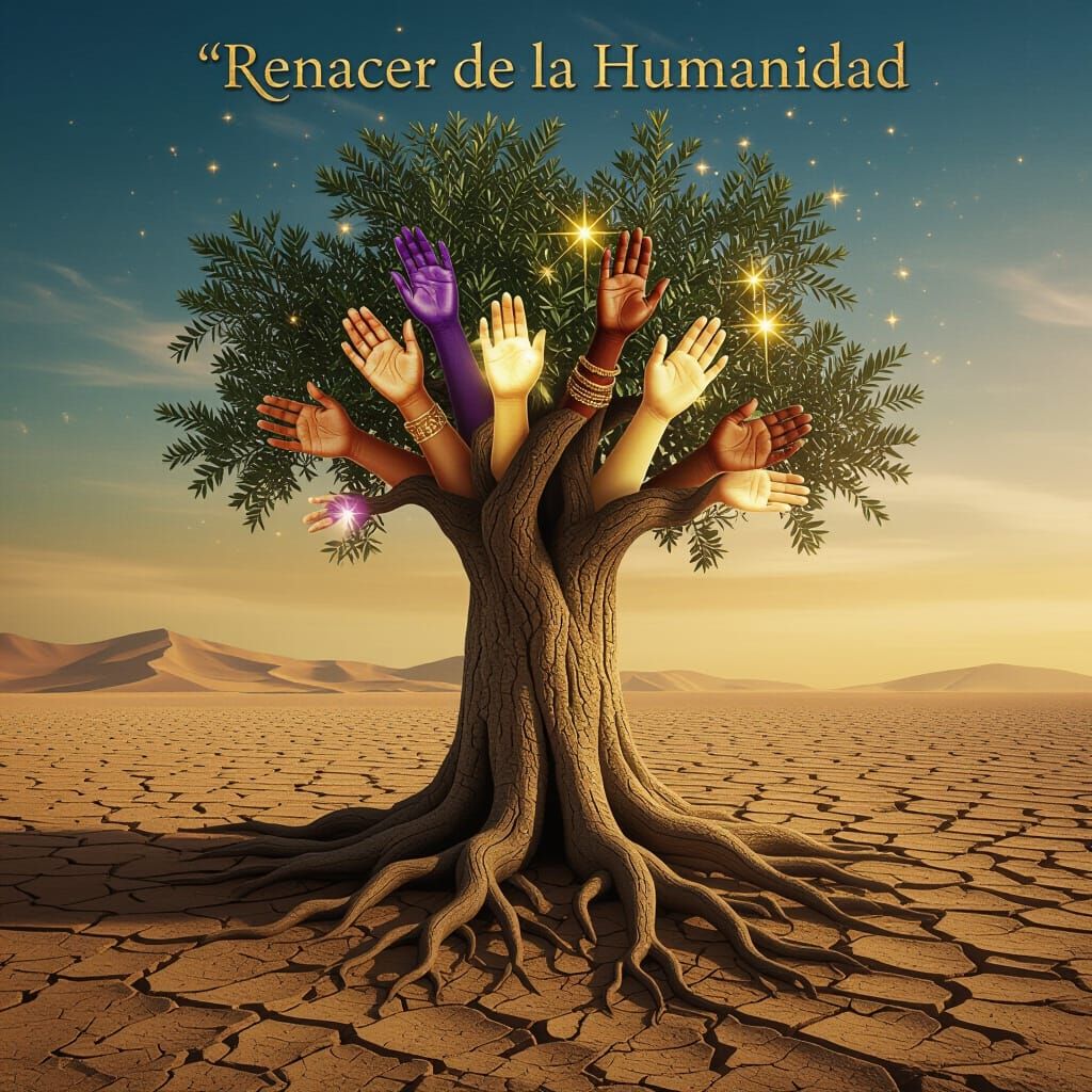 A surreal allegory of humanity's rebirth. A charred ancient olive tree sprouts luminous flowers, with diverse hands emerging from cracked earth to support it, radiating healing energy.