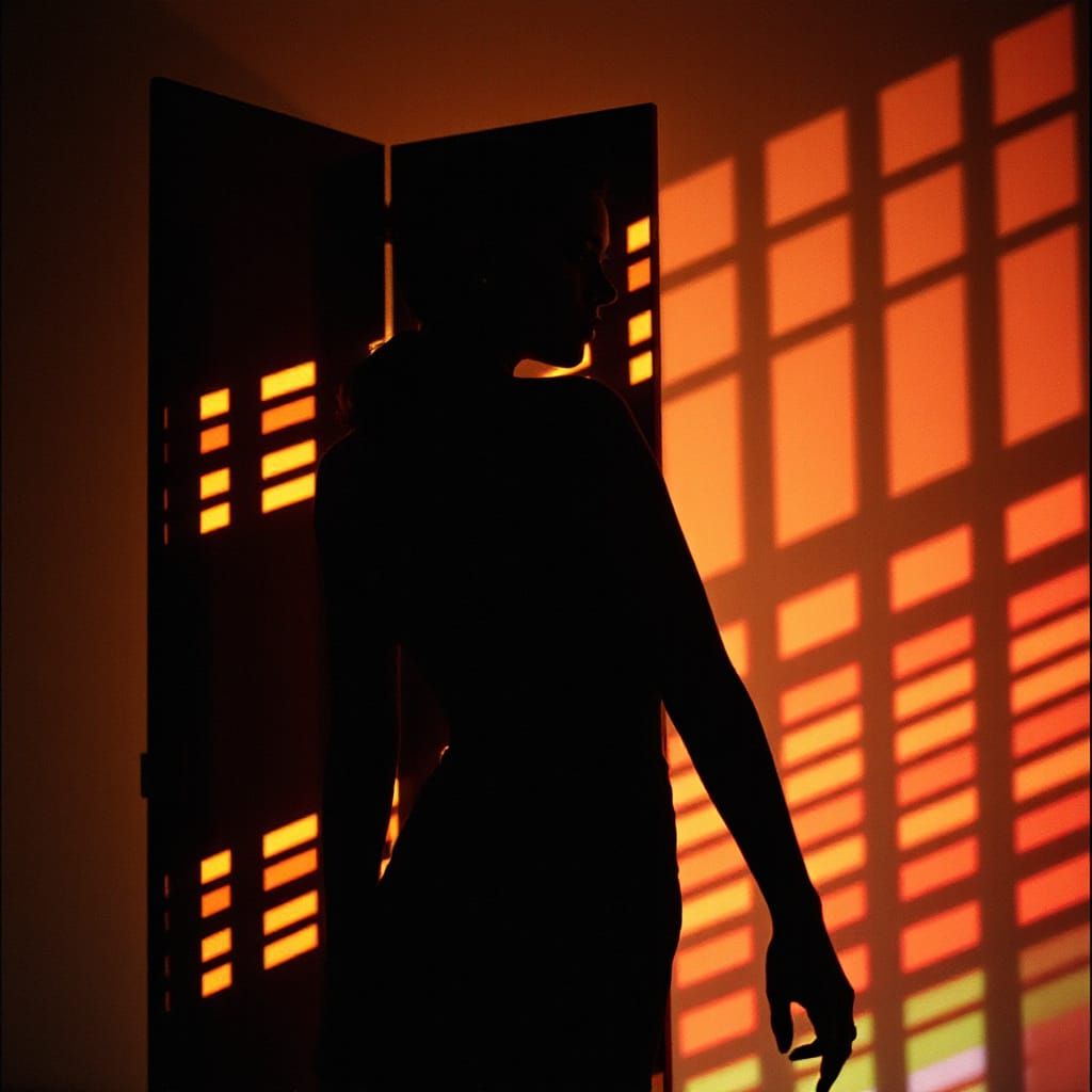 This image is a striking example of classic Hollywood glamour photography, featuring a stylized silhouette of a performer against a gradient backdrop, with dramatic lighting and striped patterns creating a sense of depth and contrast.