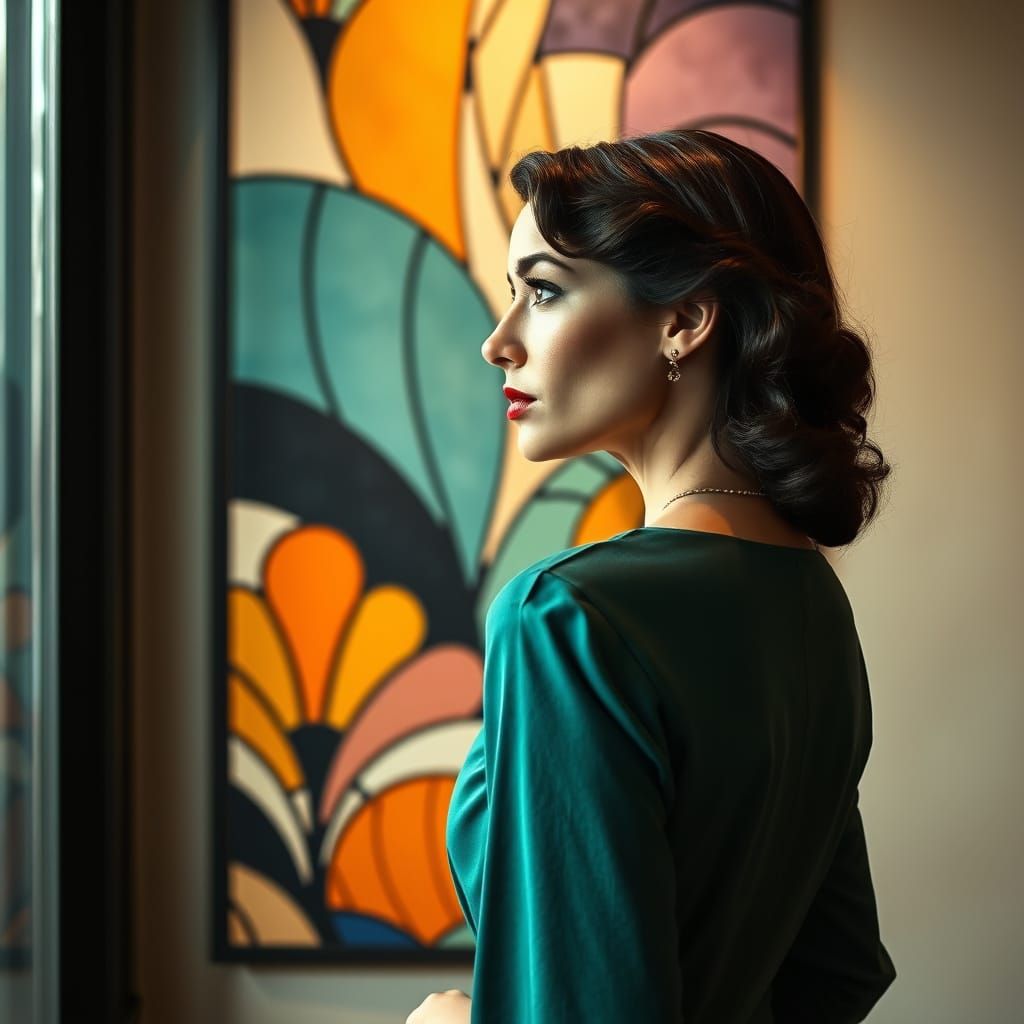 This image shows a woman in profile with elegant attire, gazing over her shoulder. Her form is seamlessly integrated with a vibrant geometric pattern on a wall, reminiscent of mosaic art and blending cubist and art deco elements.
