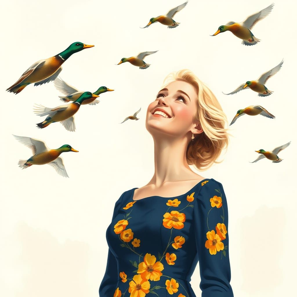 This image depicts a serene scene of a blonde woman in a dark blue dress with a yellow and orange floral pattern, gazing upwards as wild ducks soar into the sky, reminiscent of Impressionist brushstrokes and whimsical watercolors.