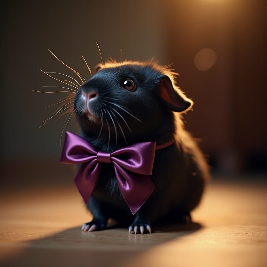 A charming image of a small black guinea pig adorned with a large, shiny purple bow. The guinea pig's whiskers twitch as it peers upwards in a dimly lit room. The image is reminiscent of vintage film aesthetics.