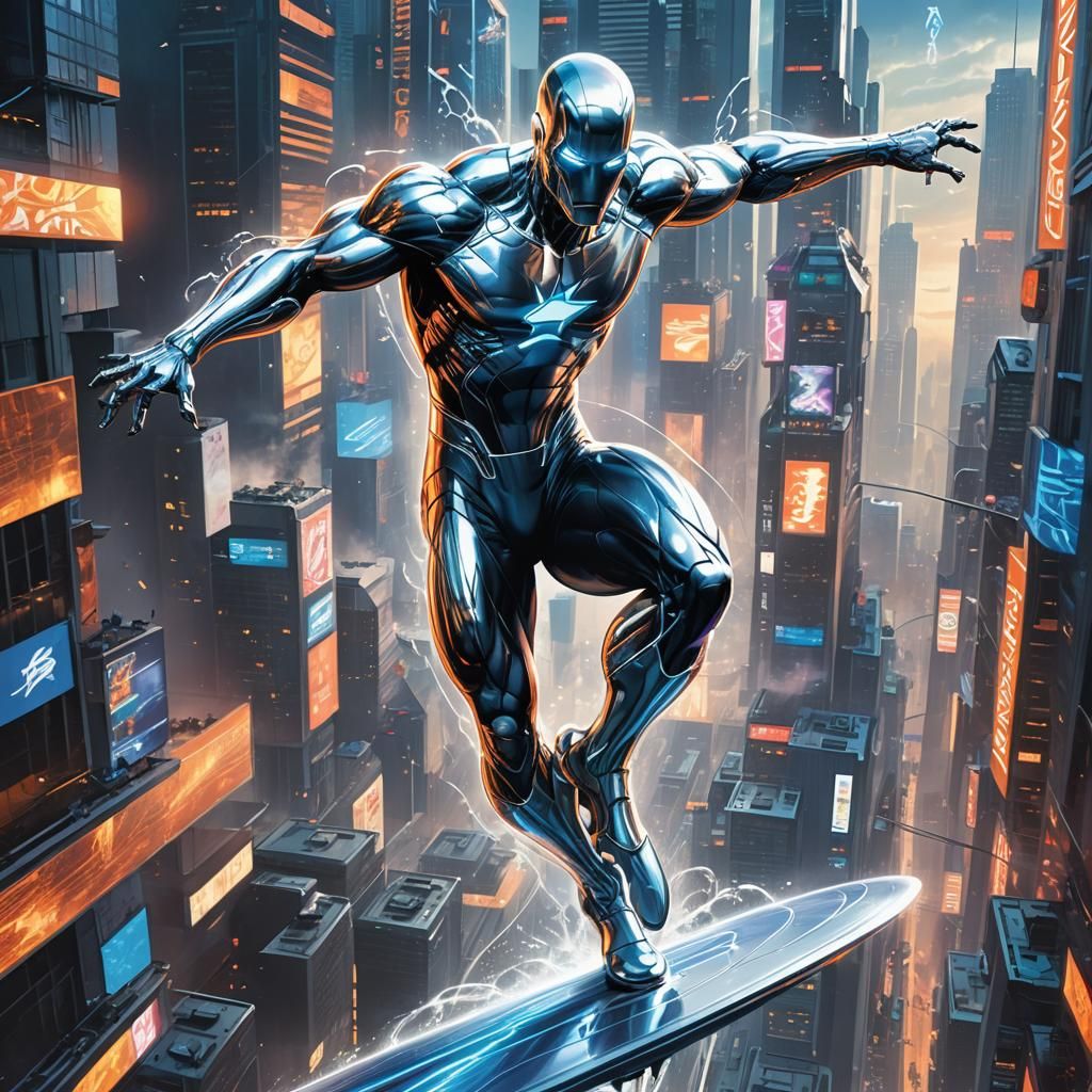 A vibrant, medium shot of the Silver Surfer soaring through a futuristic cyberpunk city. The image features triadic colors, dynamic neon lights, intricate metallic buildings, and elaborate sci-fi architecture.