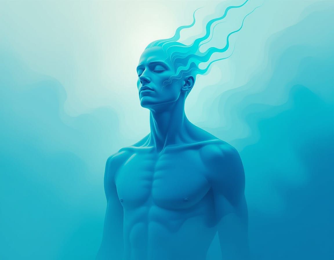 This image features a striking blue figure immersed in a gradient of turquoise and cyan. The background showcases a deep color grade with lush, velvety textures.