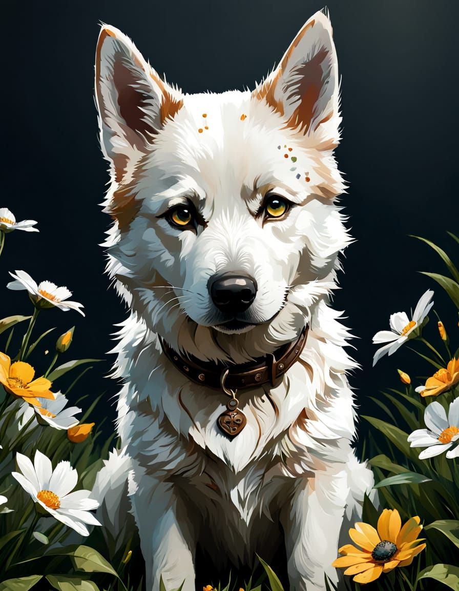 This image shows a charming digital painting of a fluffy Siberian Husky German Shepherd mix puppy dressed for spring. Created with smooth, sharp focus and intricate details, the artwork features soft lighting and a blend of white and light brown hues.