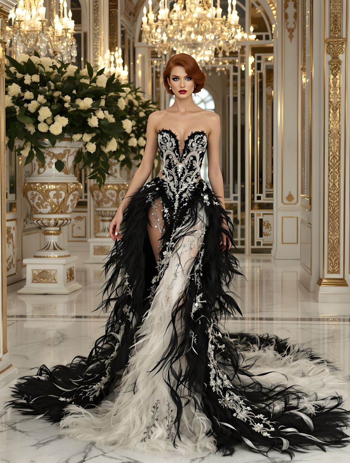 A striking picture of a red-haired model in a feathered gown. The image features opulent mansion surroundings and dramatic lighting, in an art nouveau style.