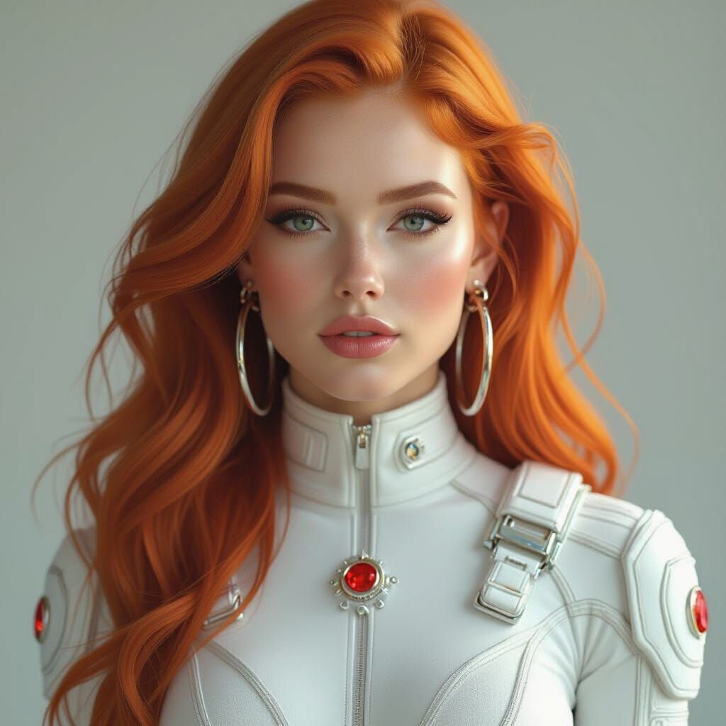 A detailed portrait of a woman with long red hair and hoop earrings. She is wearing a white bodysuit with futuristic jewelry, rendered with precise lighting and shading.