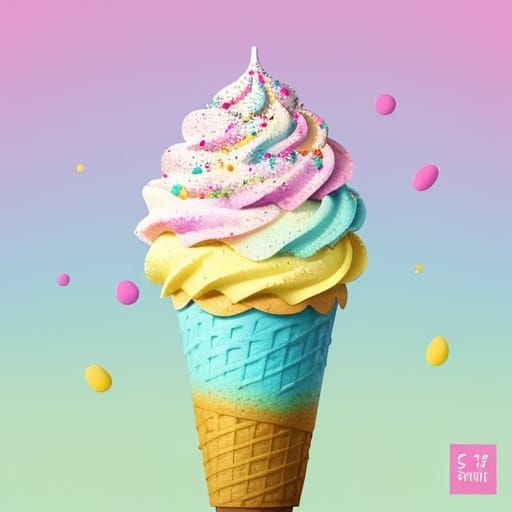This image shows a delicious ice cream cone with vibrant pastel colors and creamy texture, adorned with colorful sprinkles. The whimsical design is set against a sunny day background.