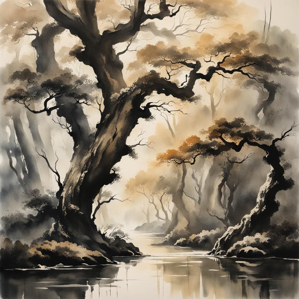 Create your own evocative ink wash paintings of old trees with our free AI image generator.