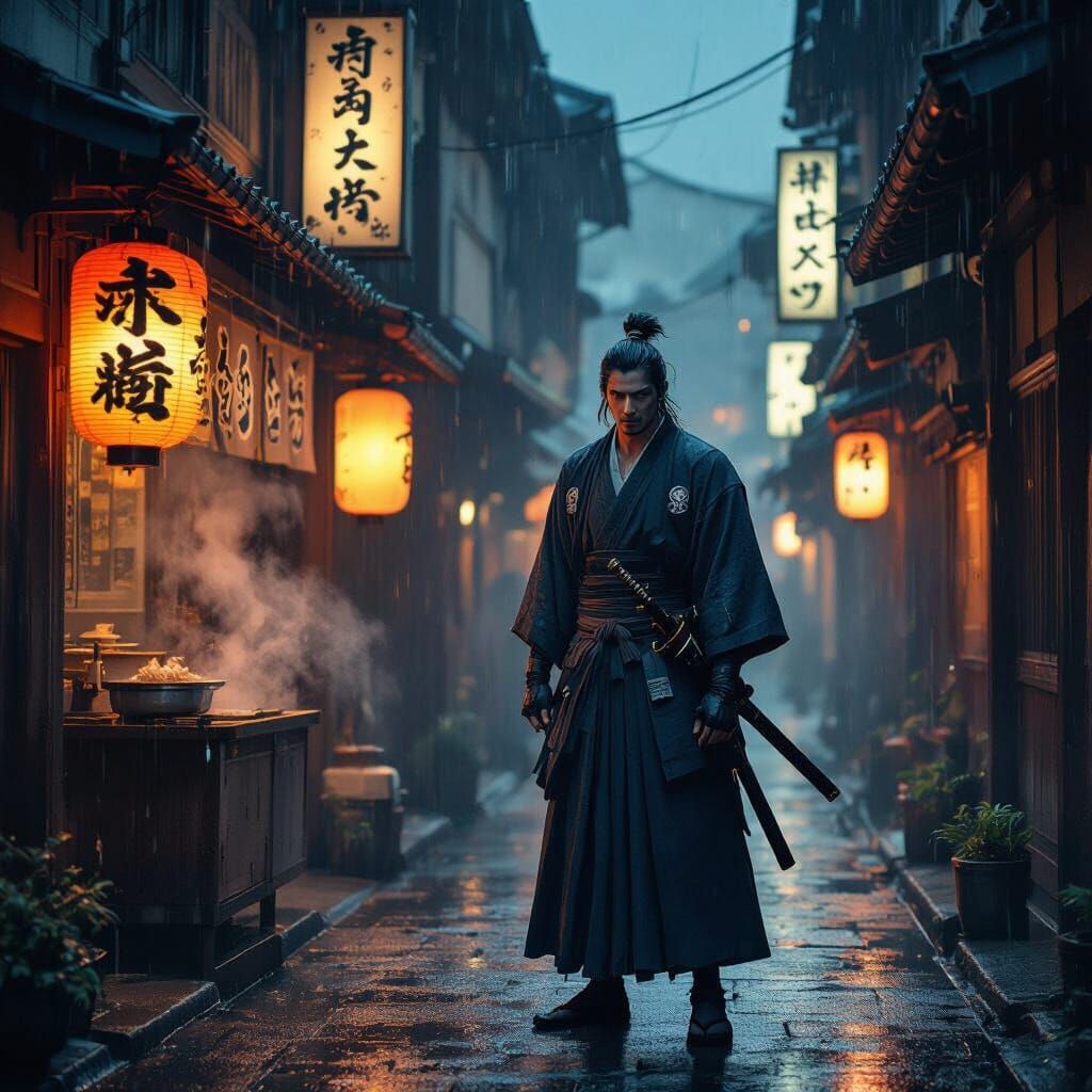 A lone samurai in a dark suit stands in a wet Kyoto alley at dusk, illuminated by paper lanterns. Inspired by gritty woodblock prints and cinematic noir lighting.