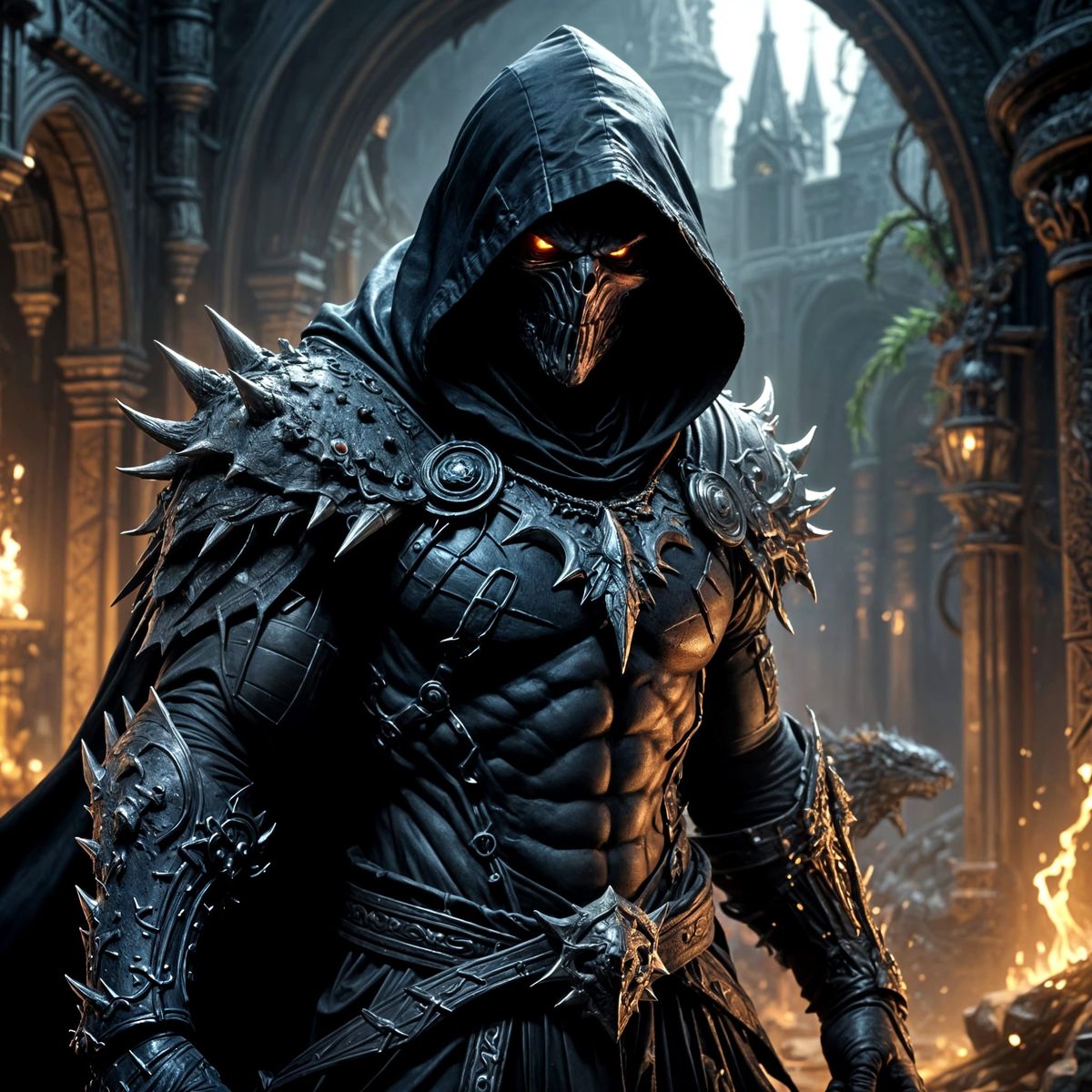 A stunning image of a muscular monk with a lizard head, shimmering eyes, and a black hooded cape. Created in a realistic style reminiscent of fantasy art, with intricate details and deep colors.