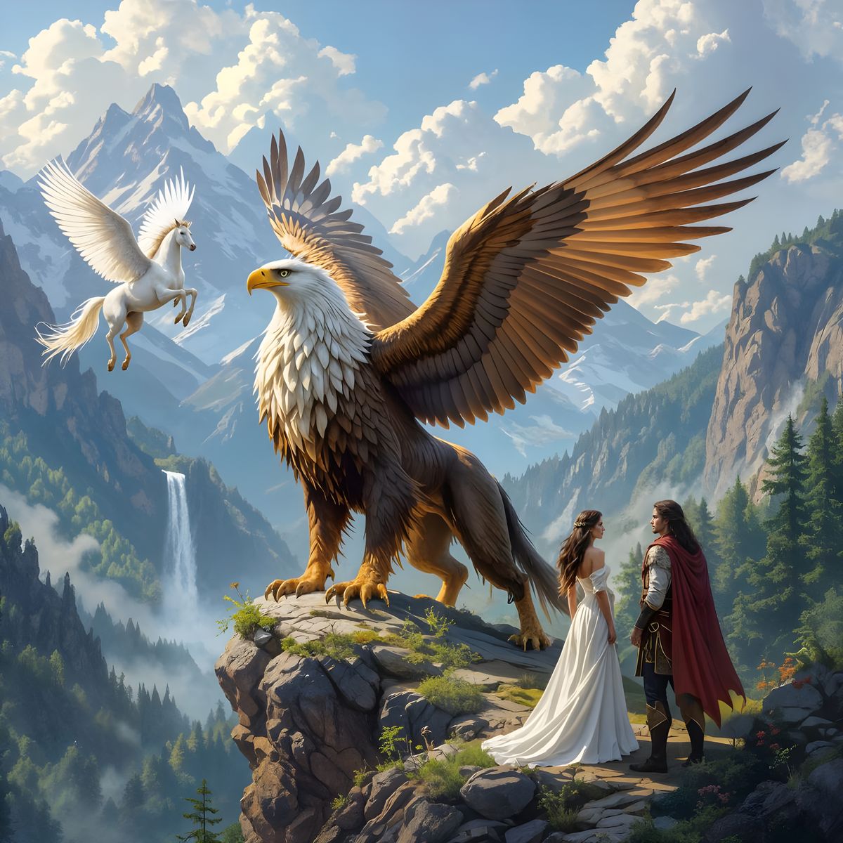 A striking picture of a griffon standing on a mountain, near a waterfall. A man and woman stand beside it as a Pegasus flies nearby. The image has a sharp focus and studio lighting.