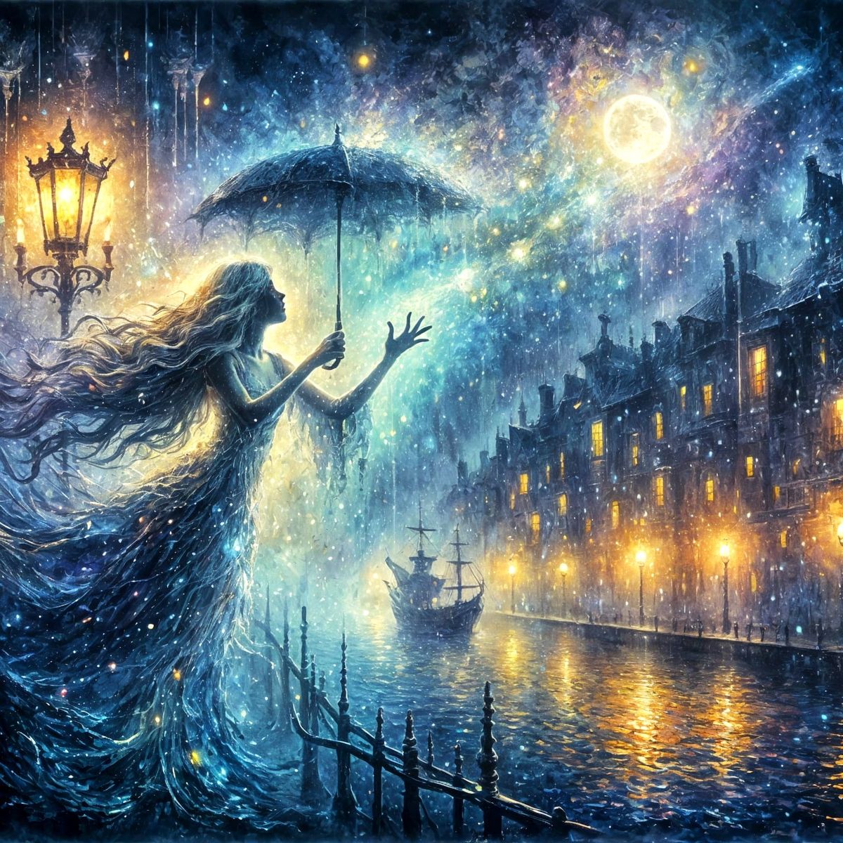 A striking picture of a shadow girl with long hair holding an umbrella under a radiant street lamp, reaching out to catch glittering raindrops. Fantasy shops and ships are visible with a magical mist in the background.