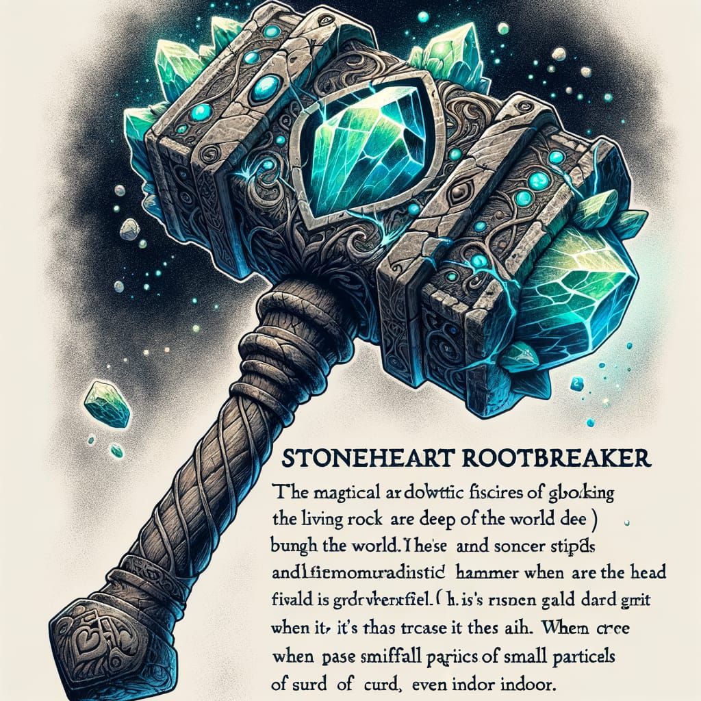 A detailed illustration of a mythical hammer, the Stoneheart Rootbreaker, with a head laced with glowing quartz and jade fissures. Dust particles swirl around it when raised.