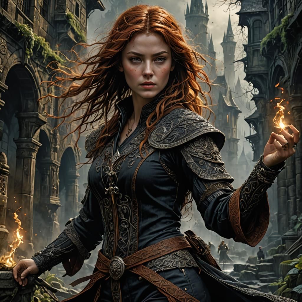This image shows a woman with auburn hair, clad in adventurer's attire, wreathed in dark magic. Her expression is angry, and she wields a sword in this dramatically lit digital painting.