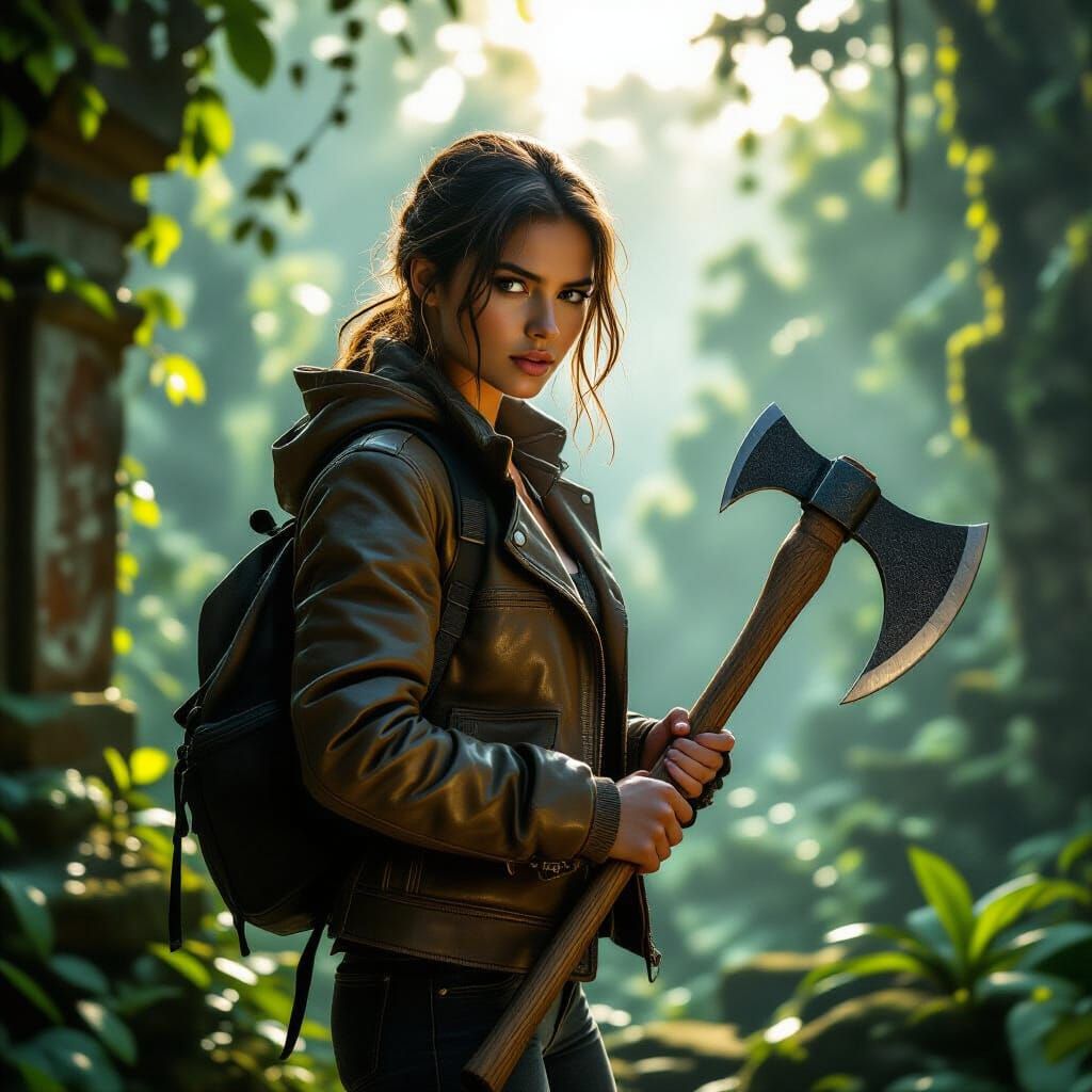 A young woman in a worn leather puffer jacket, wielding a gleaming ax, stands at the precipice of a vast, uncharted jungle. Sunlight filters through the dense canopy, casting dramatic, dappled shadows on ancient ruins overgrown with vines. The scene is captured as a cinematic film still, with a photorealistic ...