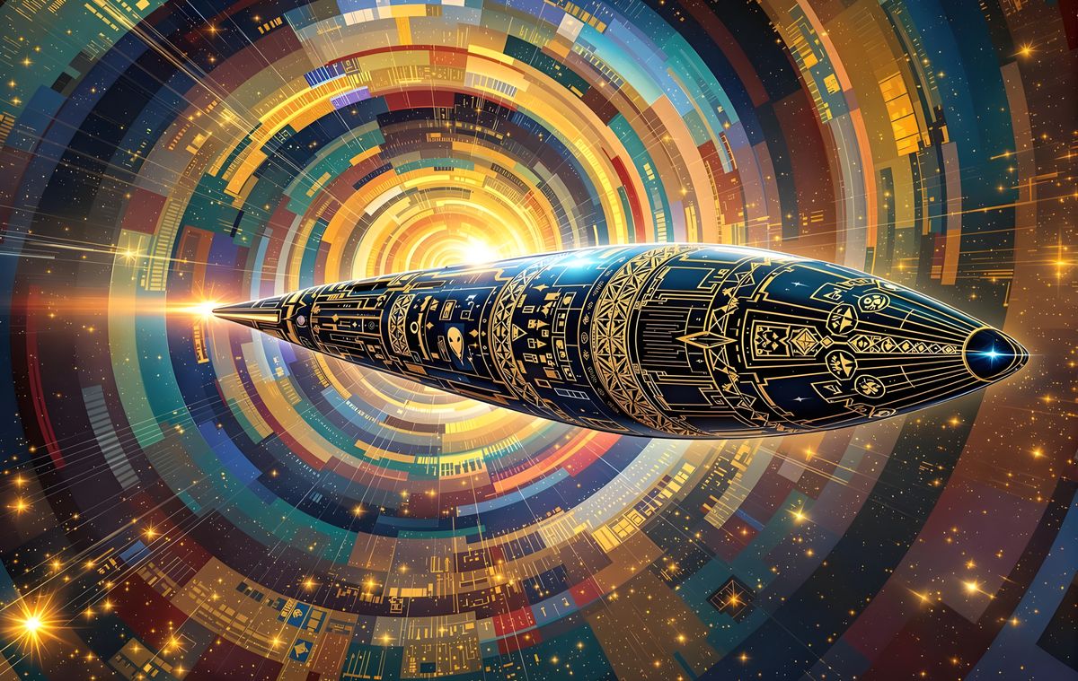This image showcases a stunning, hyper-realistic illustration of a sleek, interstellar starship, inspired by the ornate style of Gustav Klimt. The ship is adorned with glowing panels and intricate, symbolic patterns, set against a vibrant, star-filled sky in 8k resolution.