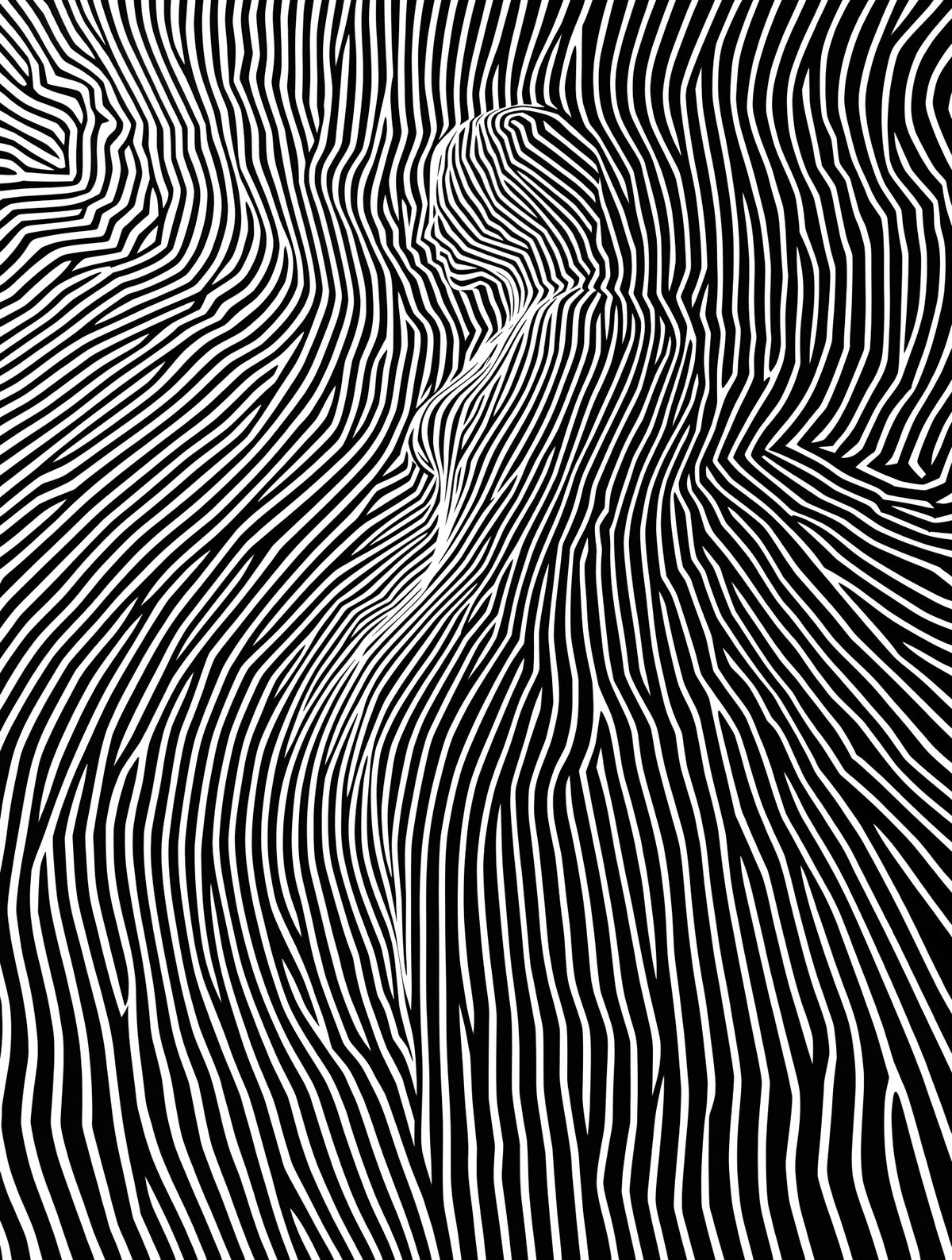This striking black and white Op Art image features a ghostly female silhouette formed by fluid, curved lines. The high-contrast composition creates a rhythmic wave-like effect with precise line distortions.
