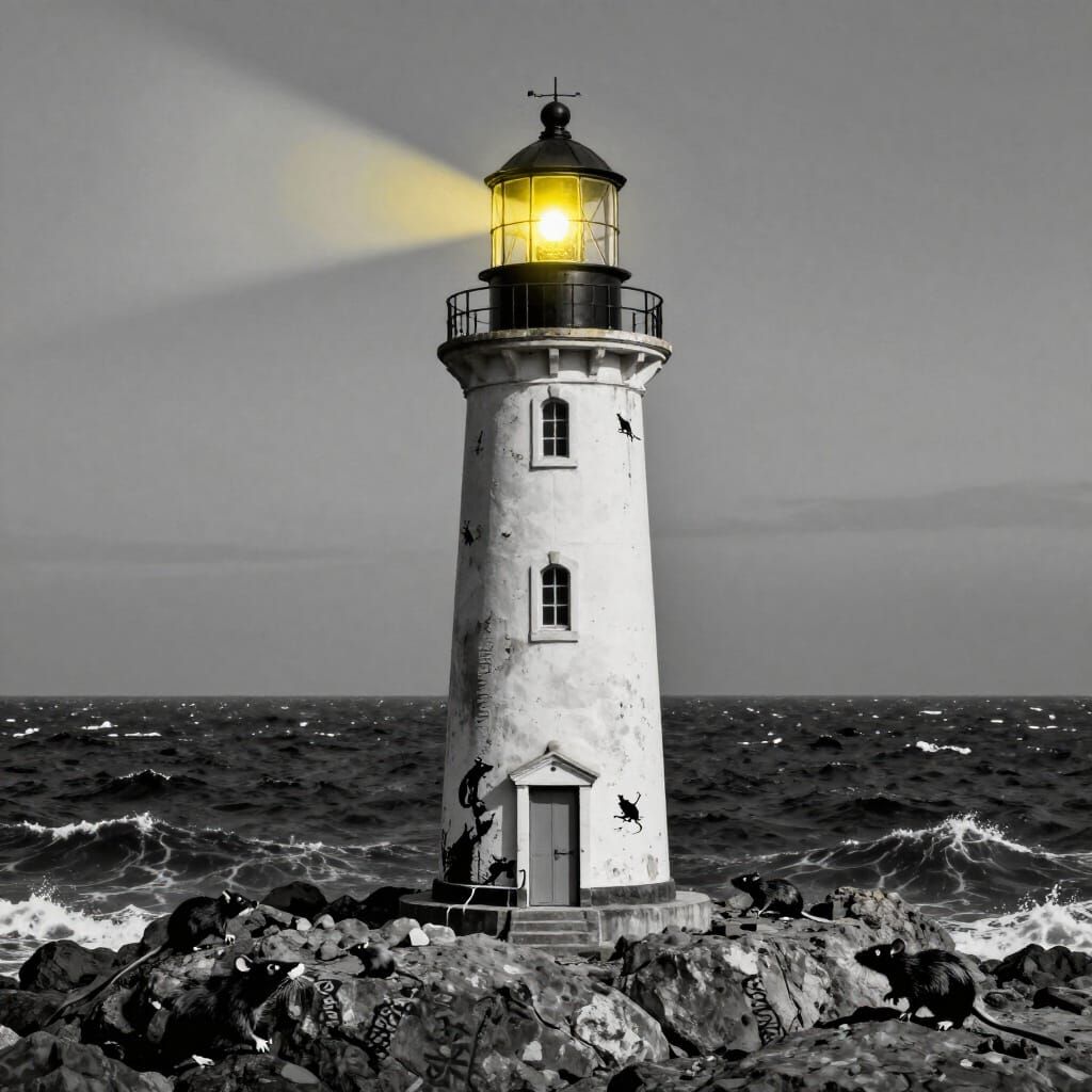 This image shows a stark lighthouse on rocks, rendered in a stencil graffiti style. Muted colors and a bright beacon convey resilience against a dark sea, with subtle rat motifs.