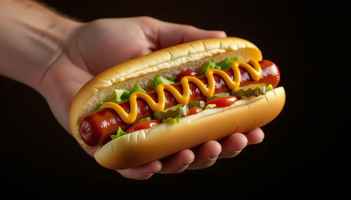 An ultra-realistic professional studio photo of a hand holding a gourmet hot dog, captured with the sharp clarity and rich detail of a Nikon Z7 camera. Only the hand and the hot dog are visible, with the background softly blurred in dark tones. The hot dog bun is golden and slightly toasted, filled with ...