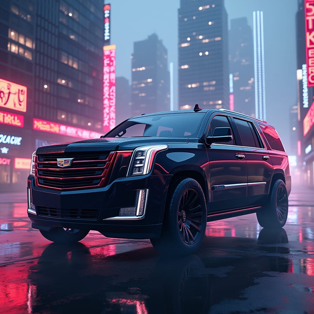 This image depicts a sleek, high-tech Cadillac Escalade 2300 CH set amidst a neon-lit cyberpunk cityscape, blending futuristic and industrial design elements in a vibrant, dramatic scene.
