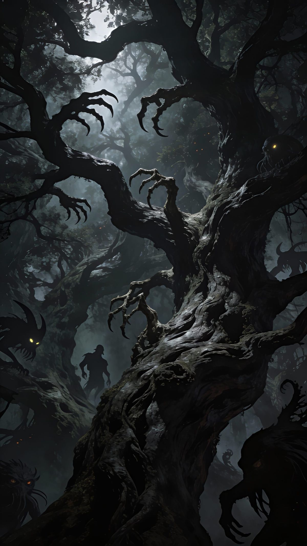 This image depicts a dark, ancient forest with gnarled, spooky trees and lurking creatures. Rendered in a dark fantasy illustration style with dramatic lighting and a desaturated palette.