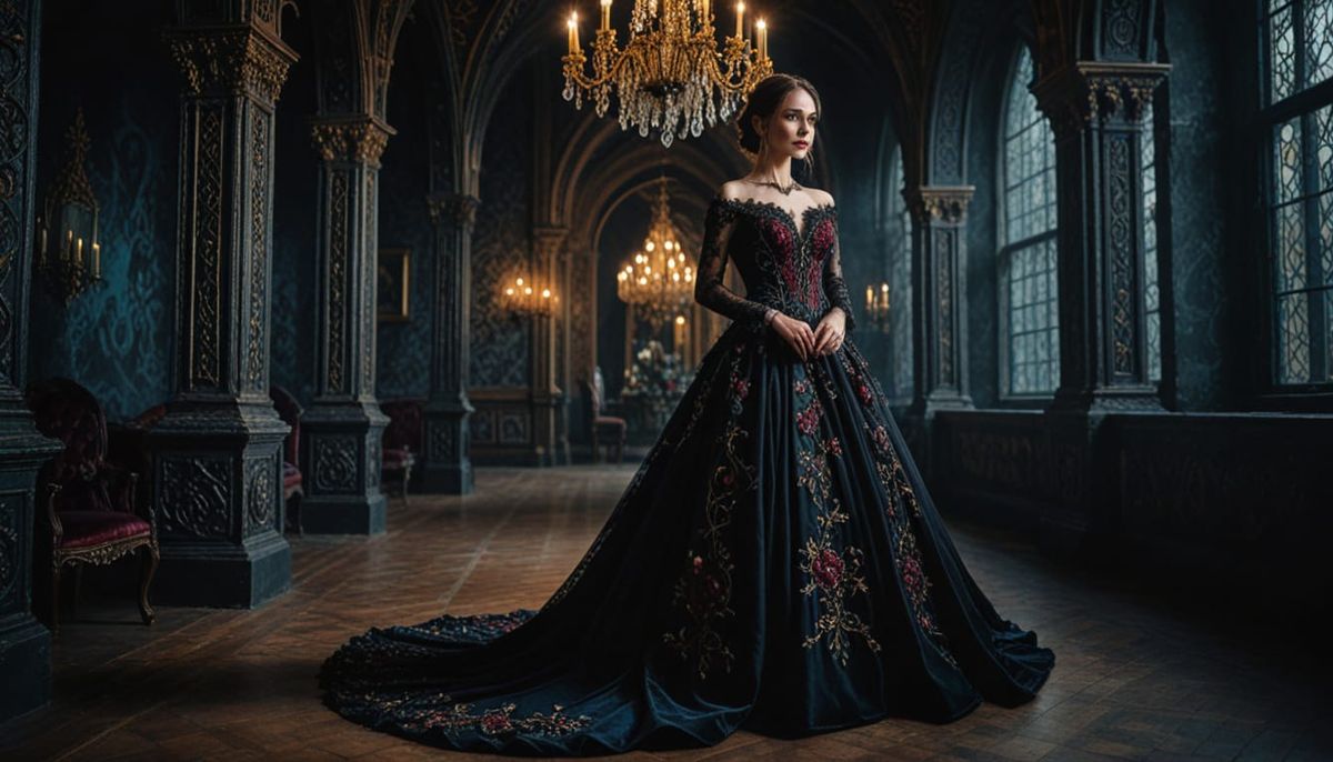 A striking picture of a woman in a gothic wedding dress. The full-body view showcases elegant lace details and velvet textures with dark jewel tones and gold accents in dramatic lighting. A gothic romance artwork.