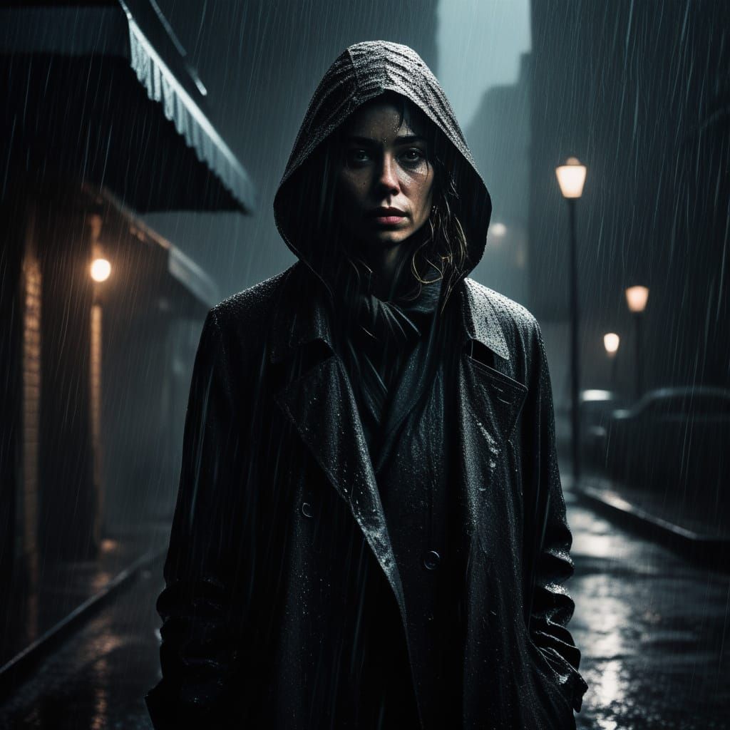 A striking image in a film noir style, featuring a solitary, rain-drenched person against dark, textured backgrounds with dramatic, high-contrast lighting.