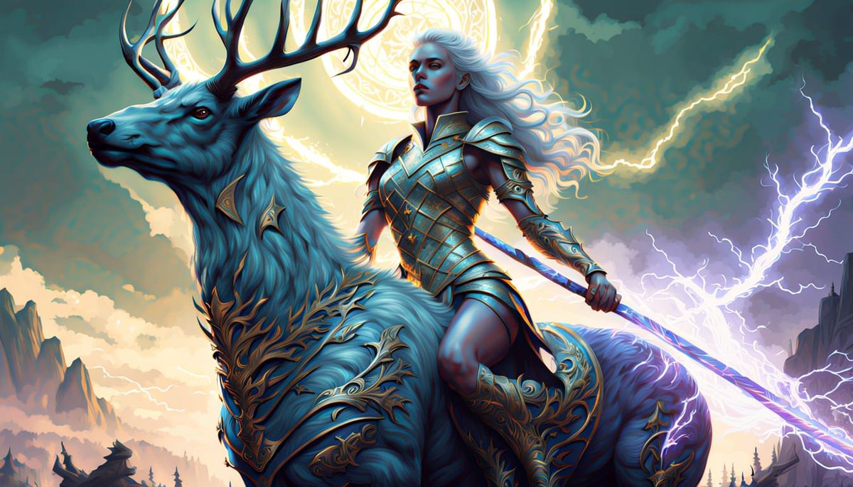 This image shows a heroic Aasimar paladin with silver hair and glowing amethyst eyes, standing valiantly on a majestic elk with vibrant green lightning energies. The scene is set in a dramatic, golden hour lighting with deep shadows, featuring intricate armor details and sacred symbols. The artwork is re...