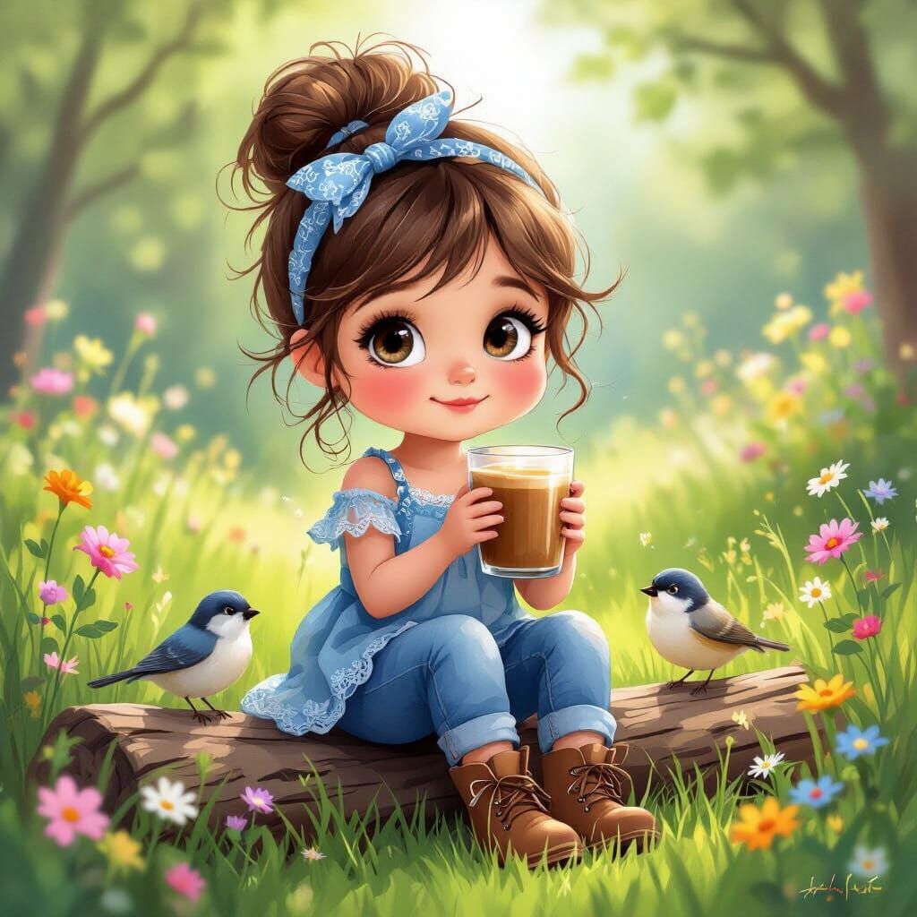 A charming image of a child with hazel eyes enjoying iced coffee in a vibrant garden. The artwork is rendered with watercolor and acrylic textures, finished with airbrushed details.