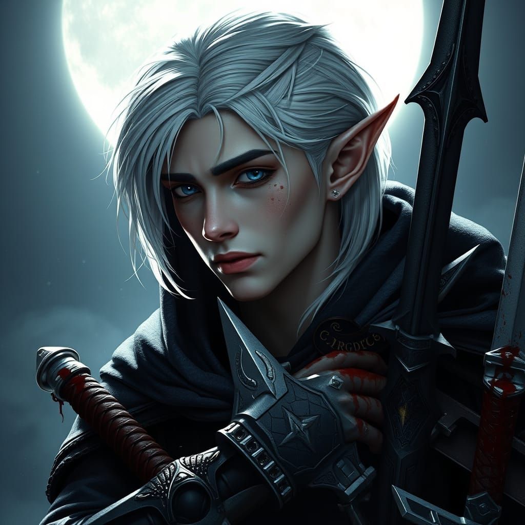 A striking picture of a young male elf assassin stepping into moonlight. He is clad in dark clothes and holds blood-drenched swords, rendered with dynamic lighting and intricate details.