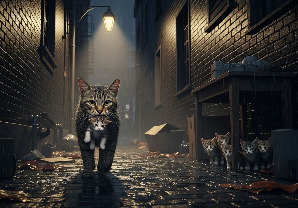 A tender scene of a mother cat carrying her kitten through a dark, rain-slicked alley illuminated by a single streetlight. Other kittens huddle in the background.