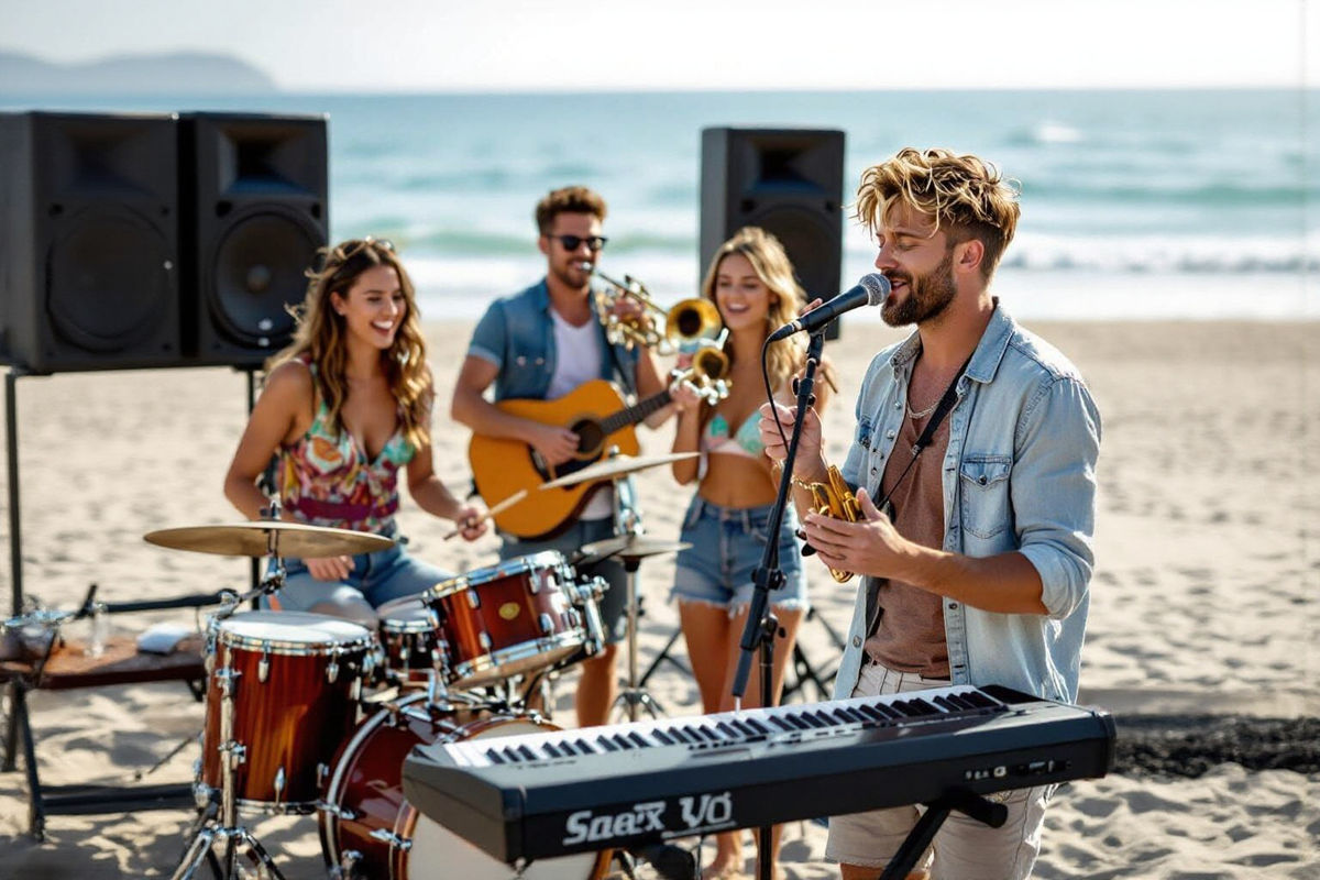 Create your own awesome band-on-the-beach images. It's free and easy to generate any image you can imagine!