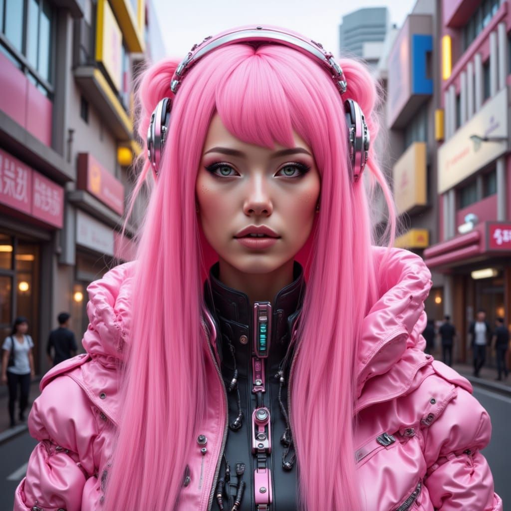 This image shows a futuristic cyborg woman with long pink hair wearing a pink jacket in Tokyo. The colorful and highly detailed image has a cyberpunk aesthetic.