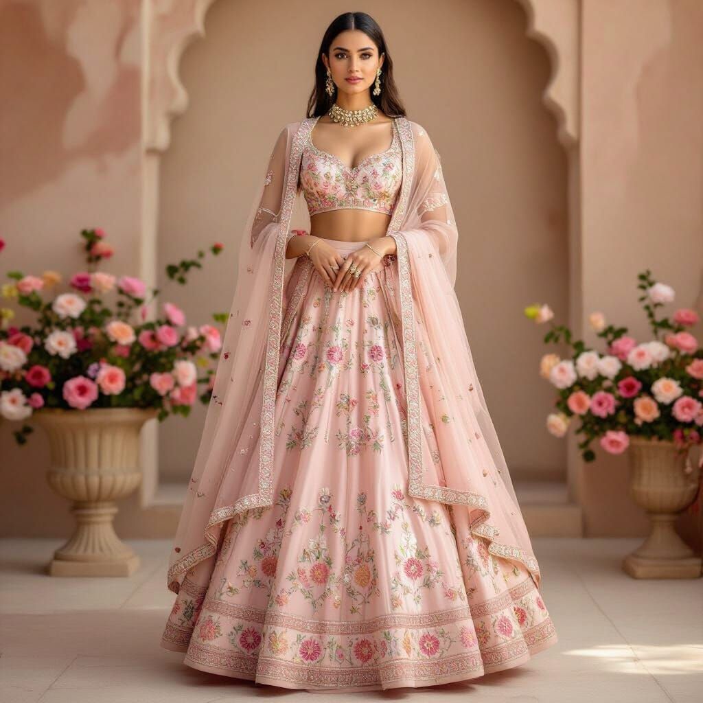 Easily create custom blush rose garden lehengas with our free AI generator. Unleash your creativity and design unique Indian wear.