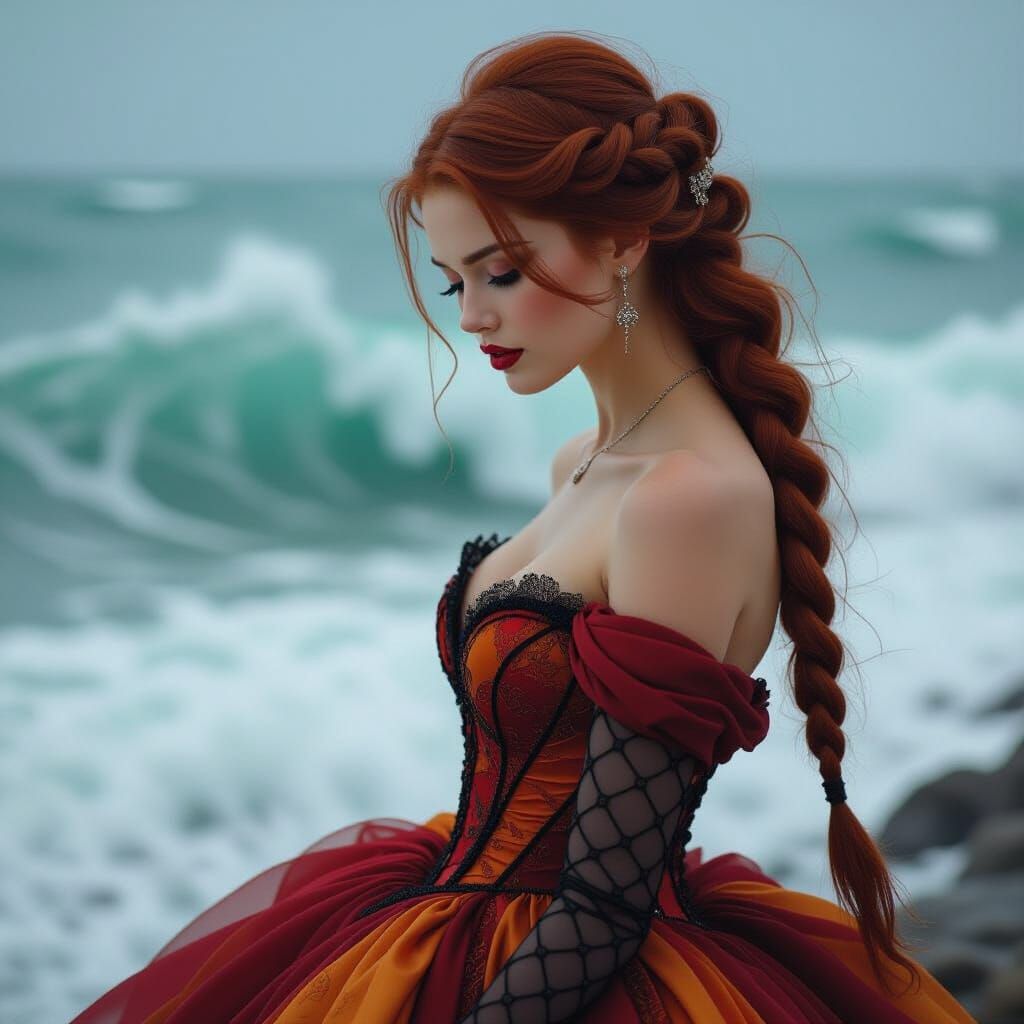 A digital portrait of a woman with crimson hair in a braid, wearing a dramatic amber and obsidian gown. The image captures a serene yet intense mood against crashing waves, with high contrast and elegant lines.