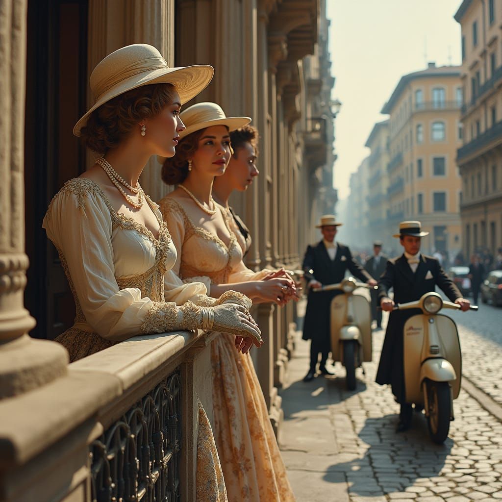 This image shows three refined Victorian ladies gazing down from a ornate balcony in Milano, observing three gentlemen with vintage Vespas on the cobblestone street below, in a style reminiscent of Impressionist masters.