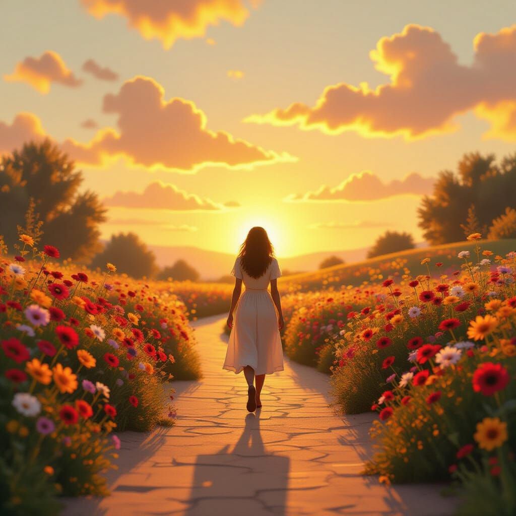 A woman walks a flower-lined path towards a radiant sunrise. This whimsical illustration captures a hopeful atmosphere with painterly textures and magical lighting.